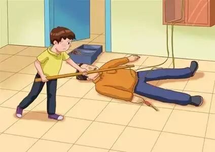 记住不要赤手救人,不要用潮湿的工具或金属物体去拨开电线,须关掉电源或用绝缘器具挑开导线。